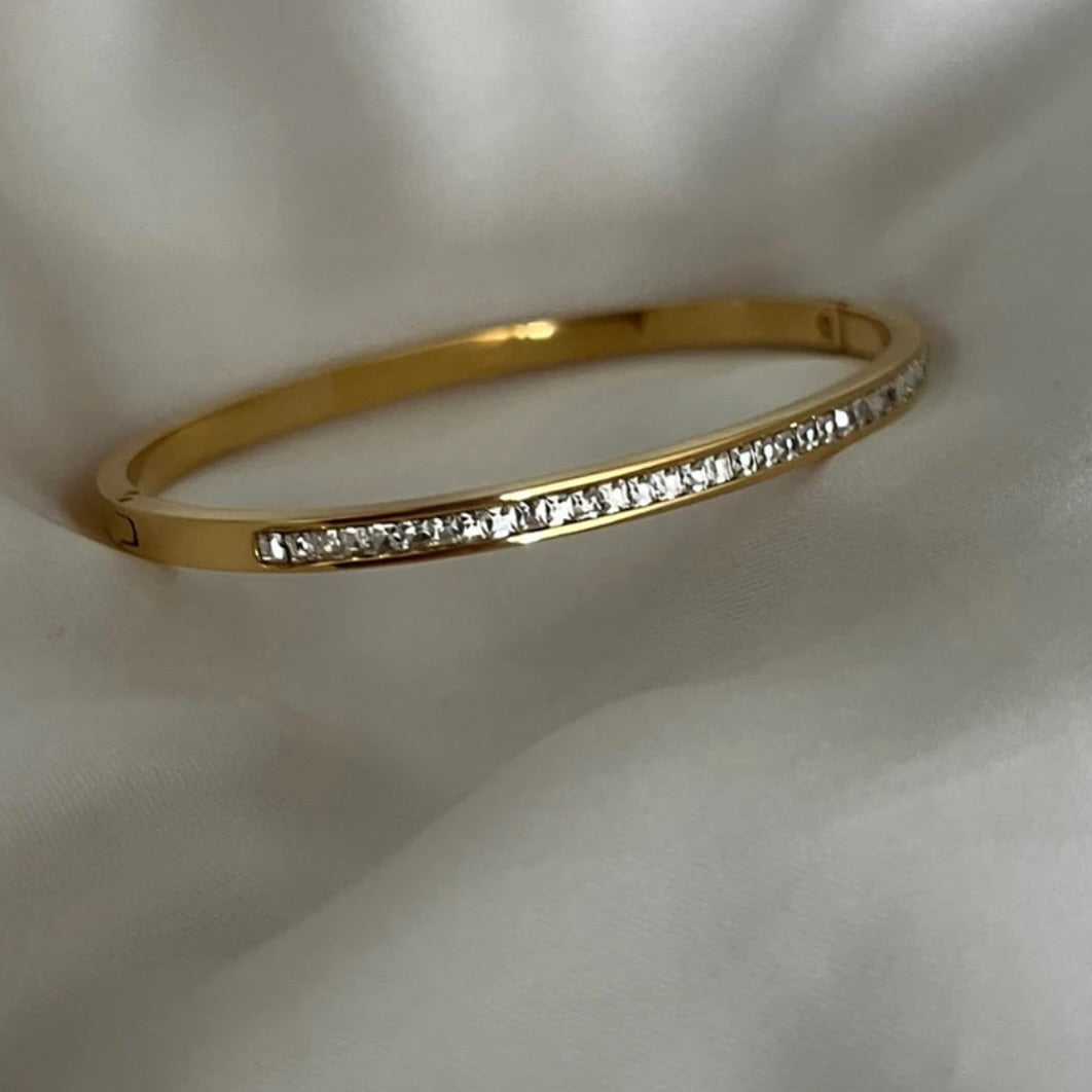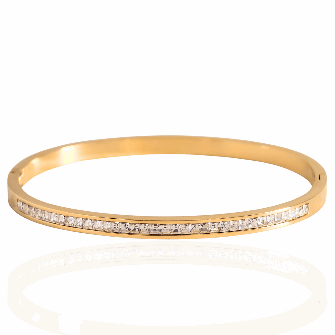 Add a touch of timeless sophistication to your look with this Elegant Crystal Bangle Bracelet. Crafted with a sleek, polished gold finish, this bangle features a row of sparkling princess-cut crystals set neatly in a channel setting. The clean, minimal design makes it the perfect accessory for both casual and formal outfits.