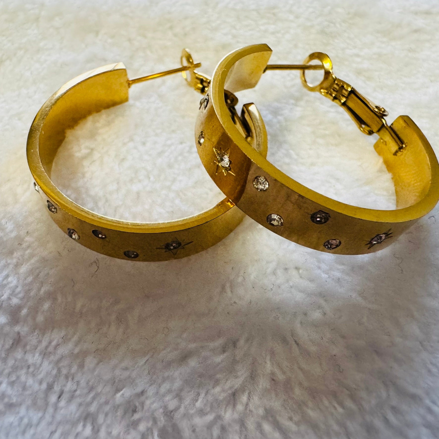 - Galaxy-Inspired Design: The earrings feature a hoop design with intricate, star-like accents, inspired by the cosmic beauty of the galaxy, making them a unique and striking accessory.