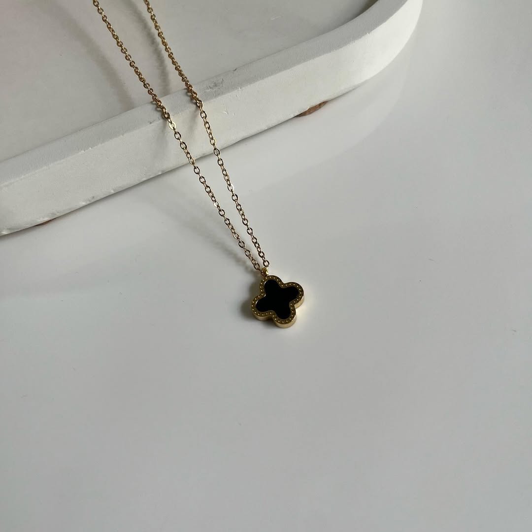 Two looks, one timeless piece. Our Reversible Clover Necklace features a stunning four-leaf clover pendant with a sleek black enamel finish on one side and a soft white enamel on the other. Easily flip it to match your mood, outfit, or aesthetic—classic and versatile in every way. Suspended from a delicate, chain, this necklace is designed for effortless layering or refined solo wear. A symbol of luck, love, and balance, it's the perfect everyday piece with a touch of thoughtful charm.