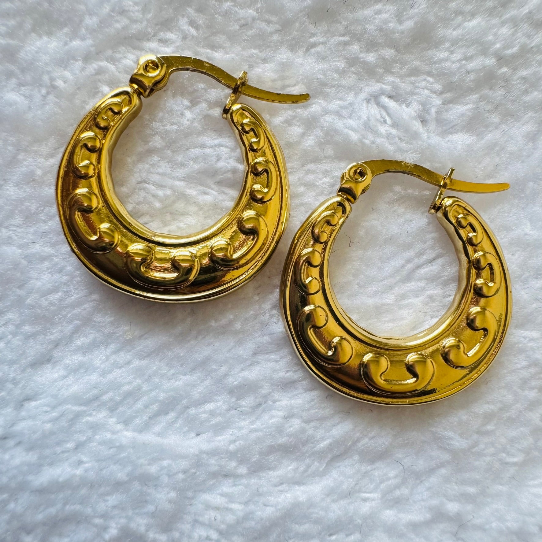 - Finish: The 18K gold plating gives the hoops a radiant, polished finish, often with a high-gloss shine that highlights the details of the design.